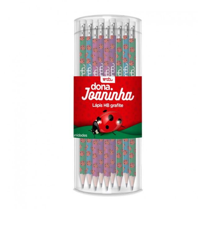 O pote contém 72 unidades deste lápis, garantindo que você tenha um suprimento duradouro para todas as suas atividades. Transforme sua rotina de escrita e desenho com o Lápis HB Grafite com Borracha - Joaninha.